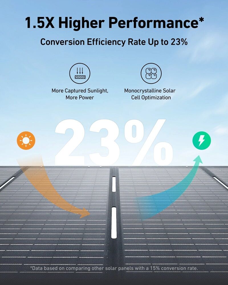 - 1.5X Higher Energy Conversion Efficiency: Monocrystalline solar cells and a powerful sunlight-trapping surface provide a conversion efficiency rate up to 23%.