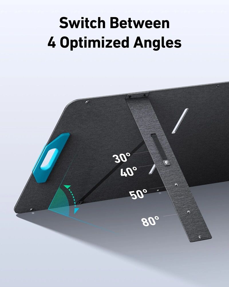 - 4 Set Angles for Max Sunlight Absorption: No matter wheryou are, the season, or time of day, you can maximize sunlight absorption. Easily switch between 30°, 40°, 50, or 80° anglees.