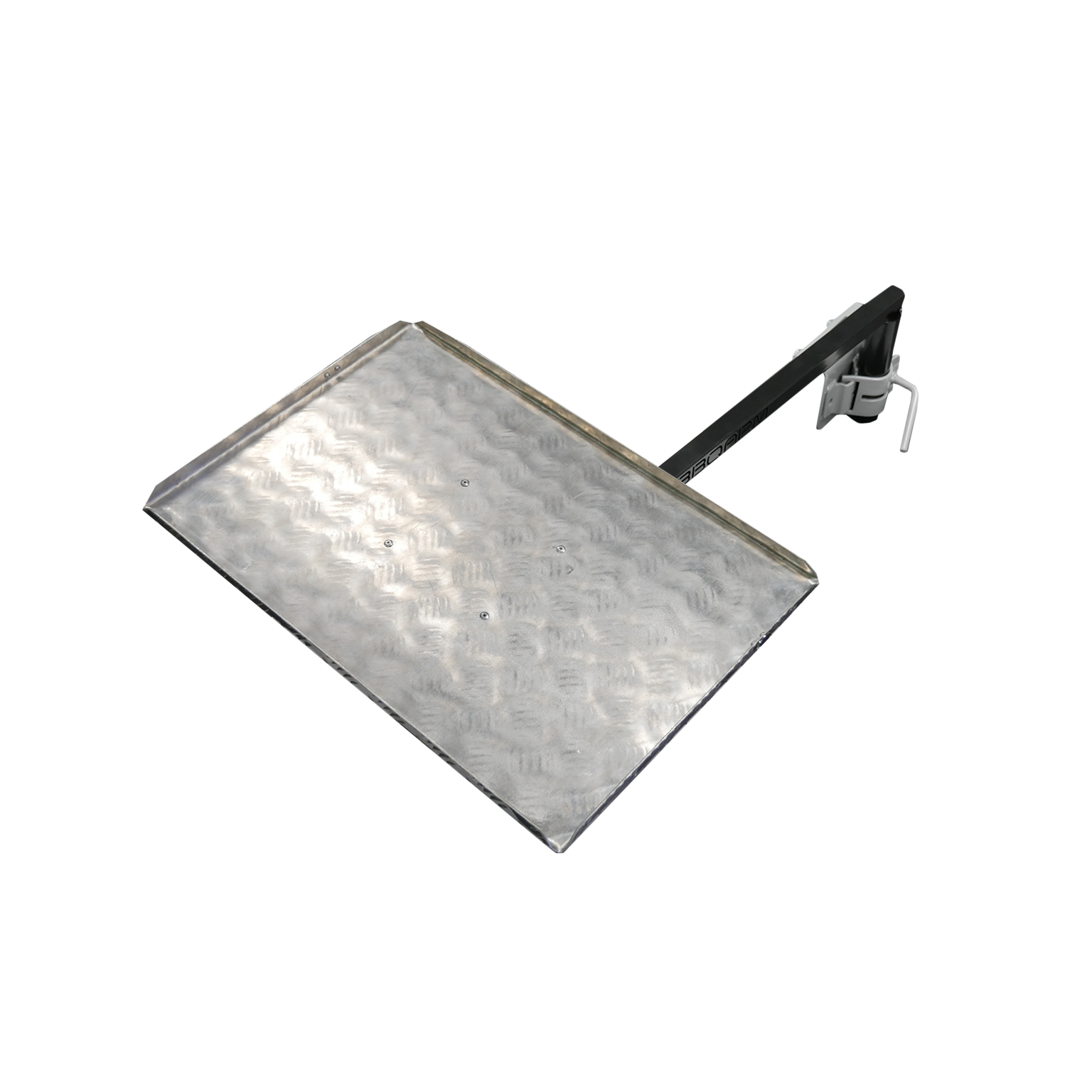 Aluminium chequer-plate tray with upturned edges and includes mounting plate attachment. Fits existing BBQARM arms. Round tube stem on all trays allows for full swivel!!