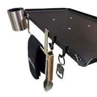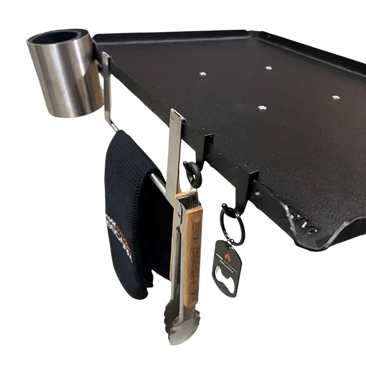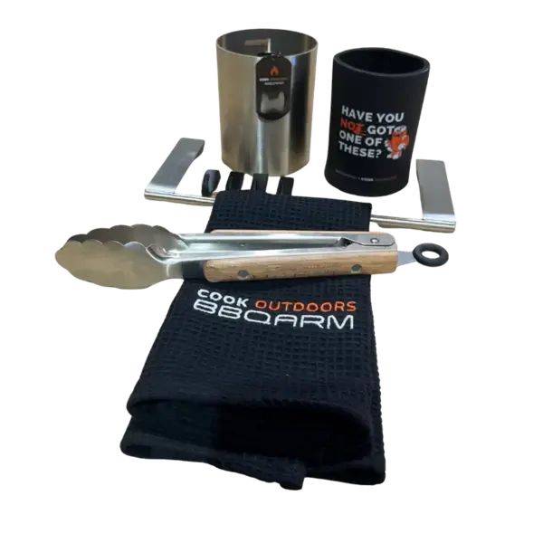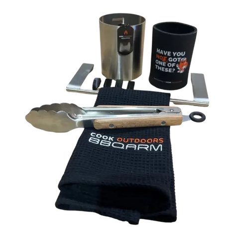Includes: Drink Holder, Stubby Cooler, Tea Towel Rail, Waffle Tea Towel, Locking BBQ Tongs, Bottle Opener and 4 Clip-On Hooks. All designed to work perfectly with your BBQARM Tray.