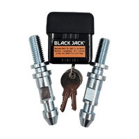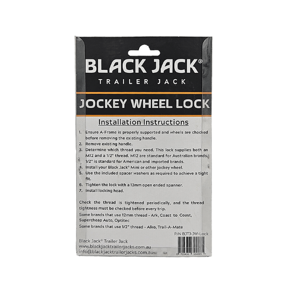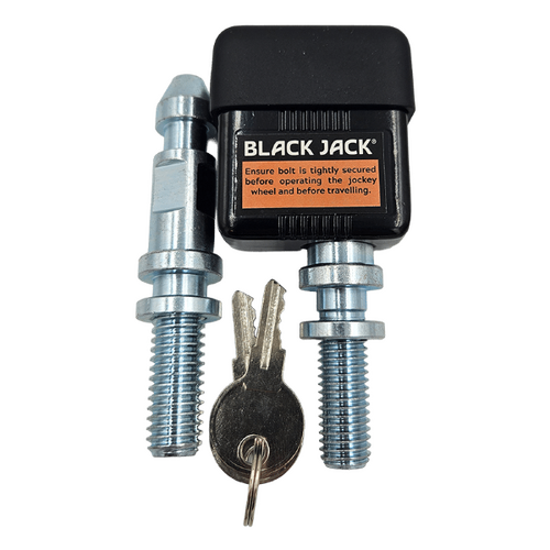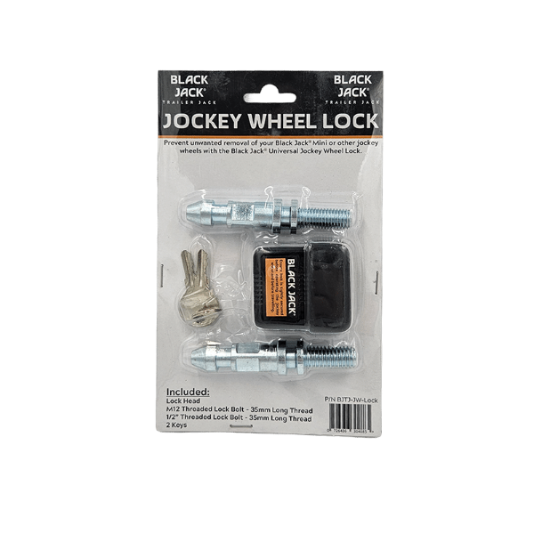 Prevent unwanted removal of your Black Jack Mini or other jockey wheels with the Black Jack Universal Jockey Wheel lock. Includes 2 pins: 1\2 inch thread and 12 mm thread to suit most jockey wheel clamps. Simple to install and provides peace of mind. In Australia, different manufacturers of jockey wheel clamps use different thread sizes that are not interchangeable. That’s why the Black Jack Jockey wheel lock comes with a choice of 2 pins to suit your clamp. Some brands that use 12mm thread: Ark, Coast to Coast, Super Cheap Auto, Optitec. Some brands that use 1\2 inch thread: Alko, Trail A Mate, BBQ Arm. Simply select the pin that suits your jockey wheel.