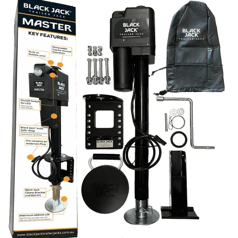 The new generation of electric trailer jack technology. The Black Jack Master is a quantum leap in technology and represents the new generation of Black Jacks. Incorporating the all-new Safe Auto Stop that automatically cuts power to the jack at either fully retracted or fully extended. The new Black Jack Master generates a massive lift capacity of 1,600kg. Ball weight is usually 10% of overall weight. So, a Caravan with overall weight (ATM) of 4,000kg will have a ball weight of approximately 400kg. The Black Jack Master will lift up to 1,600 kg so it will do it with ease. All Black Jack Master comes with a Pre-installed Anderson plug for easy “Plug and Play” connection.