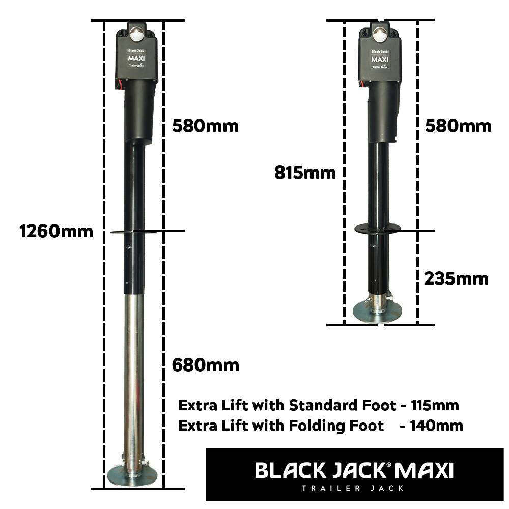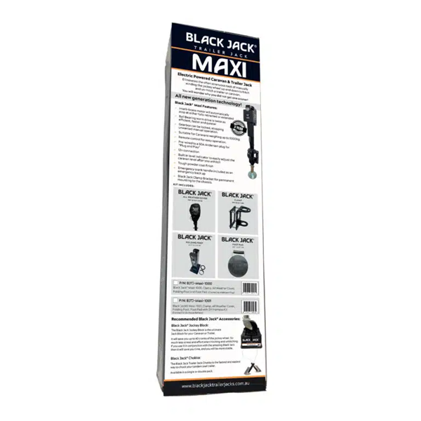 The new generation of electric trailer jack technology. The Black Jack Maxi is a quantum leap in technology and represents the new generation of Black Jacks. Incorporating an Intelli-Brake motor that automatically cuts power to the jack at either fully retracted or fully extended. Remote control operation allows for easier hitching and unhitching and makes levelling your caravan a breeze. The new Black Jack Maxi boasts a ball bearing worm drive that is twice as efficient, faster and quieter, and generates a massive lift capacity of 2,000kg. All Black Jack Maxi’s come with a Pre-installed Anderson plug for easy “Plug and Play” connection.
