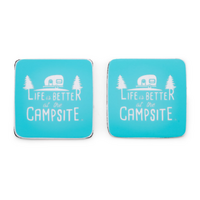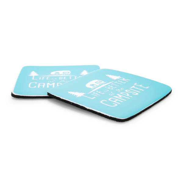 Show off your love for camping whether you’re at home or outdoors! Drink coasters help prevent rings and water marks on your furniture. These coaters feature a unique “Life Is Better at the Campsite” logo/retro RV pattern teardrop trailer and trees. Made of neoprene.