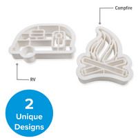 Camco's Life is Better at the Campsite Cookie Cutters are perfect for making decorative cookies. The pack includes (2) unique camp themed shapes that are great for RV enthusiasts. The RV-shaped cookie cutter measures 4-inches x 2 ¾-inches and the campfire cookie cutter measures 3-inches x 3 ¾-inches. They are made from food safe plastic.