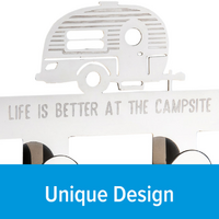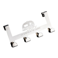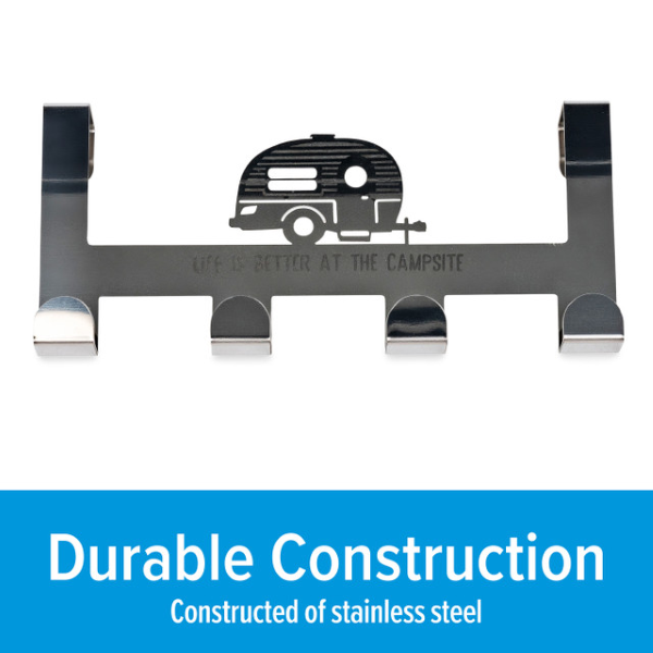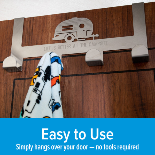 Camco's Life is Better at the Campsite Over the Door Towel Hanger provides (4) hooks for hanging towels, bathrobes, jackets, hats, scarves, purses and more. It is an ideal solution for small places—great for bedrooms, bathrooms and closets. The hanger fits standard interior doors up to 1 ½-inches thick. Easy to use, it simply hangs over your door—no tools required. Features a retro RV design with the phrase, "Life is Better at the Campsite". Constructed of durable stainless steel.