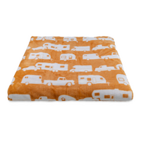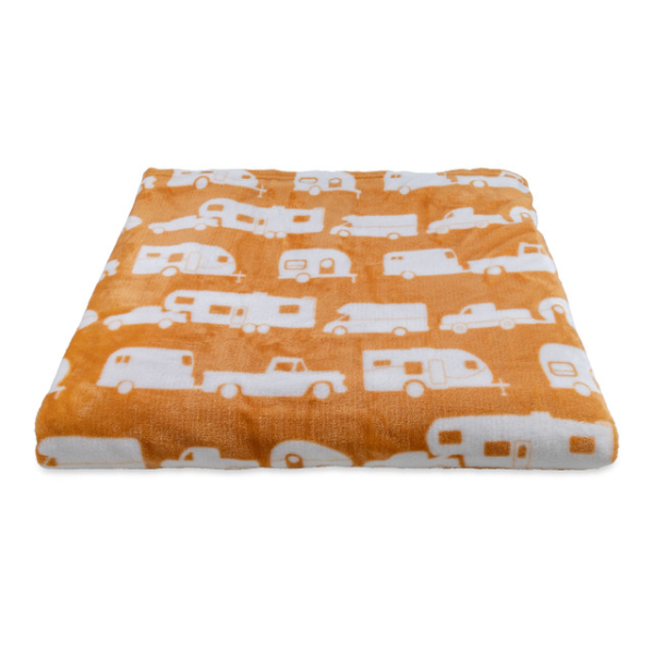 Camco's Life is Better at the Campsite Plush Fleece Blanket helps keep you warm and comfortable while at home, camping or on picnics. This queen-sized blanket measures 90-inches (L) x 90-inches (W) and is made of 100% ultra-soft plush polyester. It is autumn gold colored and features a Camco brand RV print. The blanket is machine washable for easy cleaning—see the care tag for details.