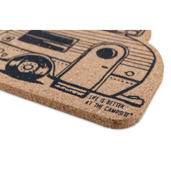Show off your love for camping and RVing whether you’re at home or outdoors! Drink coasters help prevent rings and water marks on your furniture. These coasters feature a unique camper shaped design. Made of cork.