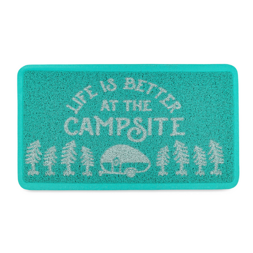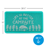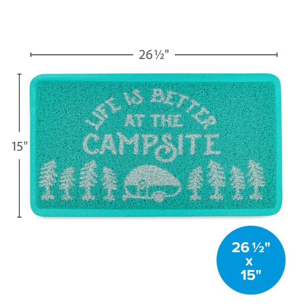Stylish “Life Is Better at the Campsite” door mats are great for home, outdoors, under a pet bowl or camping! Use them to help trap dirt and debris to prevent bigger messes. Looped PVC material dries quickly, provides a cushioned step and is easy to clean. This mat comes in teal with a white "Life is Better at the Campsite" retro RV trailer and tree line print. It measures 26 1/2-inches x 15-inches.