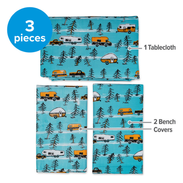 Camco's Life is Better at the Campsite Tablecloth with Bench Covers provide a clean eating and seating surface for camping, picnics and other outdoor activities.