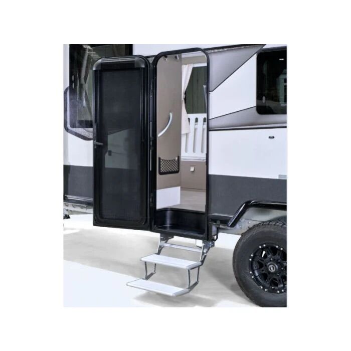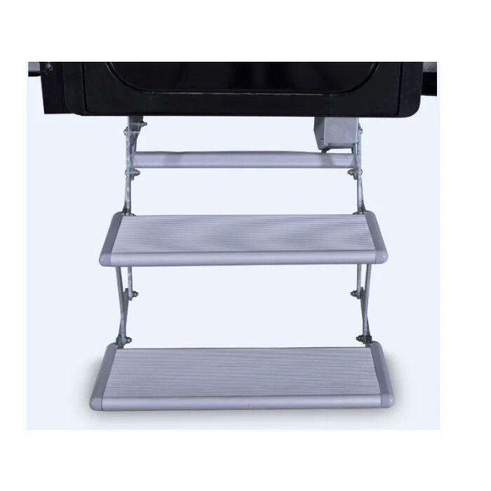 The Camec electric step is a fantastic addition to your caravan or motorhome. These steps have an aluminium tread and the frame is constructed from galvanised steel. They have a 12V motor that extends and stores the step which is operated by a switch that is placed just inside the doorway. The mounting bracket can be bolted or welded to the chassis and are 554mm from outside to outside.