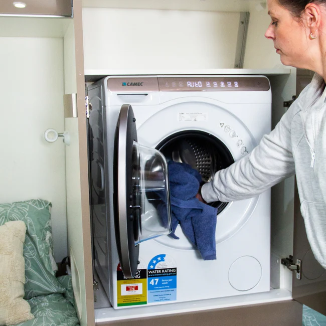 CAMEC’s next generation COMPACT RV front load washing machine has arrived. Our next generation model has a 3.5 starenergy rating combined with a 3.5 star WELS (Water Efficiency) rating. Specifically designed for Australia’s harsh conditions,it’s perfectly suited for all caravan and RV installations.