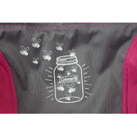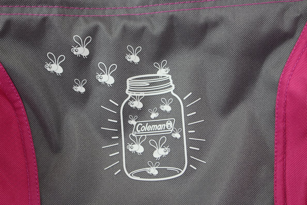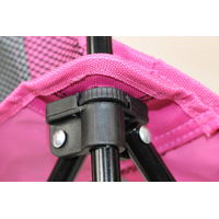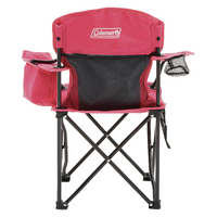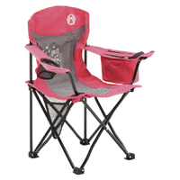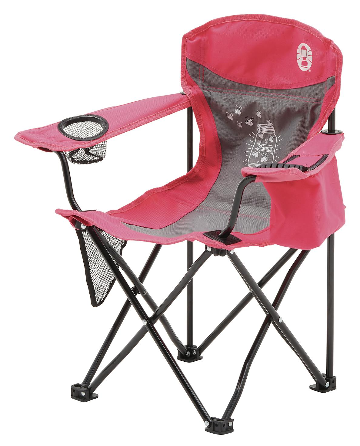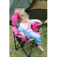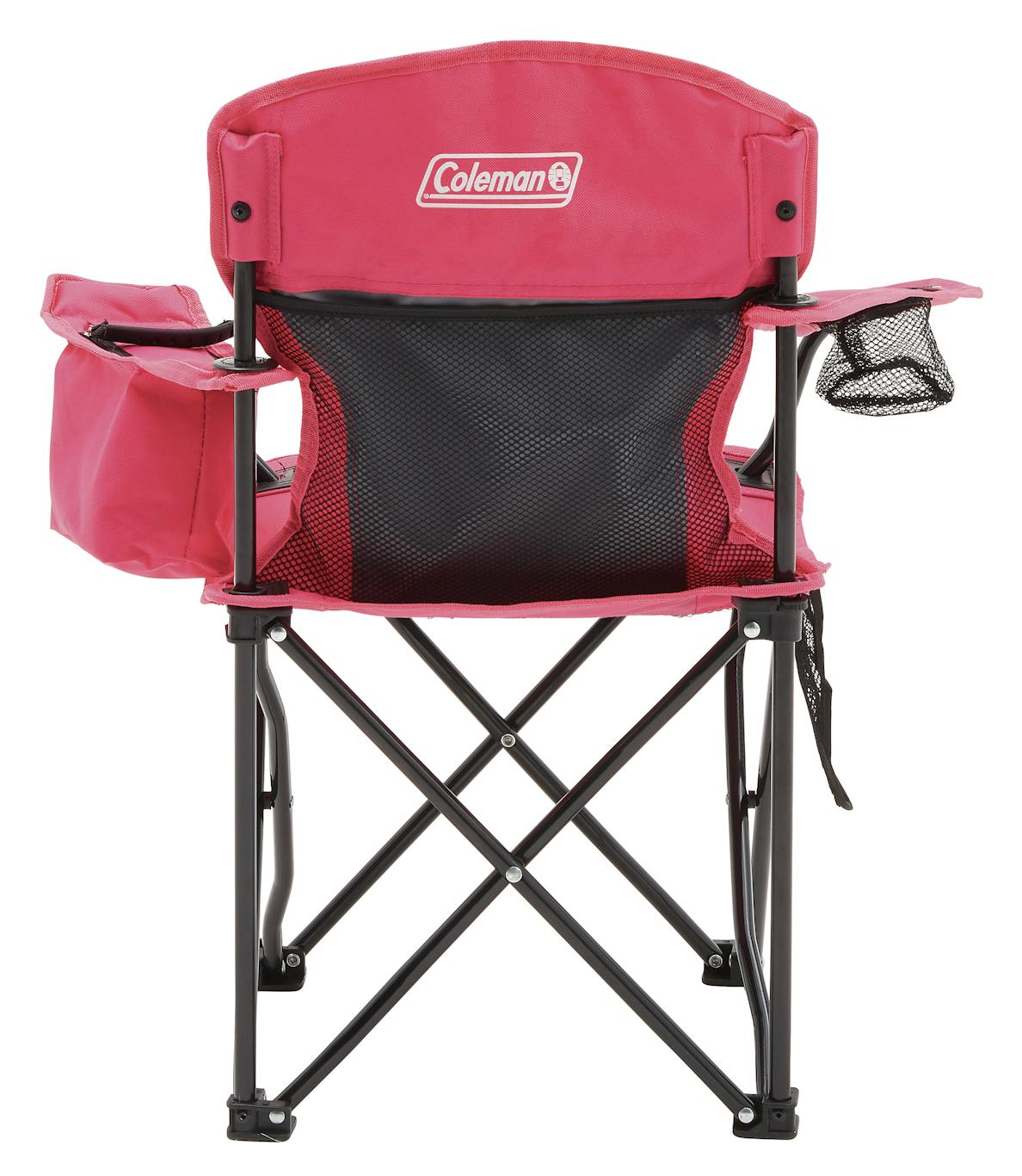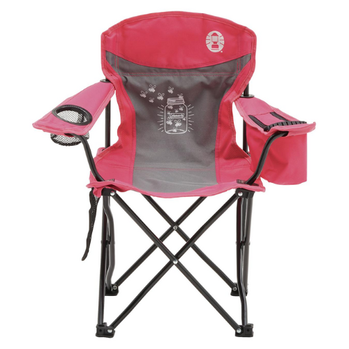 Fun design that glows in the dark. Insulated cooler arm and mesh drink holder. Handy storage pockets and padded back rest. Locking frame stays secure. Compact quad fold design. Includes carry bag with strap for easy storage and transportation. Weight capacity: 70kg.