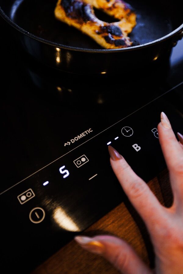 The Dometic 2 zone induction cooktop is a modern kitchen appliance that uses electromagnetic technology to heat cookware directly. Compared to the traditional gas or electric stovetops that transfer of heat indirectly through the burner. The induction cooktop generates an electromagnetic field that interacts with the magnetic material in the bottom of compatible cookware. This process creates heat directly in the cookware, making the cooking process faster and up to 25 to 50% more energy-efficient.