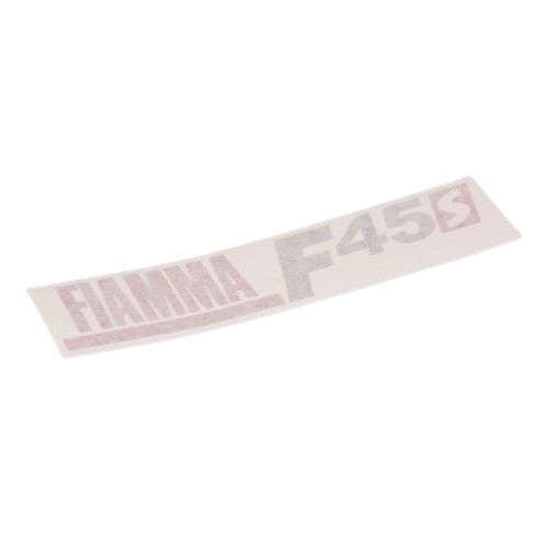 Replacement sticker for the front lead bar of the Fiamma F45 S awning. This sticker has the "Fiamma" name in red and "F45" in grey text. The "S" is a red square with the S cut out in white. This is standard fitted to the Polar White case awning.