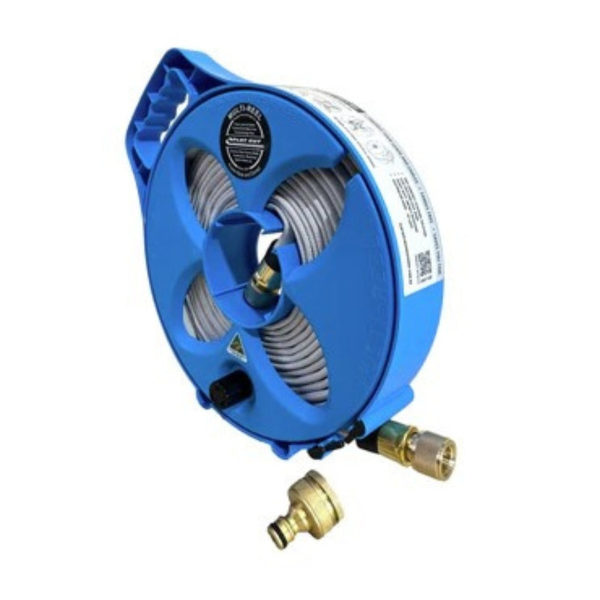 - Includes: 7.5m drink water hose with brass snap on fittings, dual size 3/4 and 1" BSP brass tap adaptor, Electric Blue Compact Multi-Reel