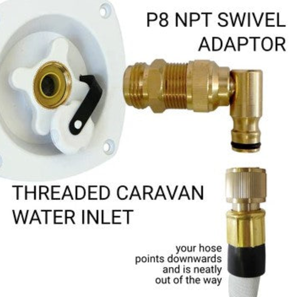 If your water inlet on your caravan/RV/yacht looks like the one in the image, it will have a 1-1/6 inch NPT thread which isn’t the same as all other plumbing fittings in Australia. (A BSP threaded fitting available at any Aussie hardware store sized ‘3/4 inch’ will fit for a couple of turns but then leak when pressurised.)