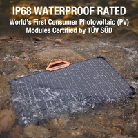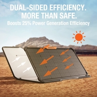 The upgraded solar panel generates electricity from both sides. The solar cell on the back side absorbs reflective and diffused sunlight, boosting 25% of conversion rate. IP68 waterproof and dustproof certified against harsh weather conditions.