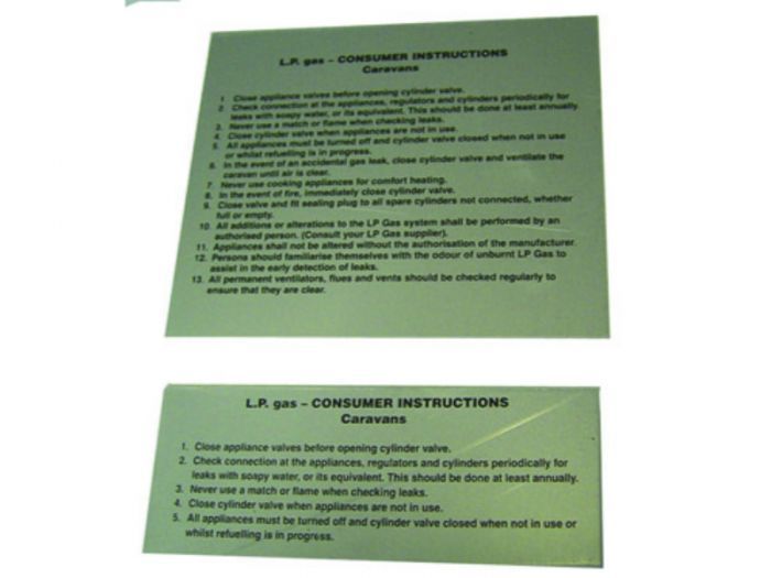 Metal gas instruction plate with consumer instructions for fixing to caravans / marine craft.