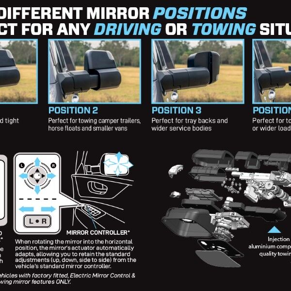The large single mirror lens creates less confusion and enhanced safety while driving. The four, easily adjustable positions, provide greater vision, with less vibration to any towing situation, while maintaining ADR compliance and safety. When the mirror is rotated into the horizontal position, the mirror’s actuator automatically adapts, allowing for standard adjustments (up, down, side to side) from the vehicle’s standard mirror controller. This caters to drivers of differing height and seated positions.