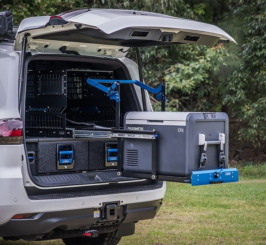 Perfect for preparing a quick meal for the family when on the road. The Drop SlideTM lowers 30 centimetres while extending over the tailgate of the vehicle, allowing easy access to a fridge, toolbox or generator. The slide remains in a horizontal position when lowering, avoiding any contact with the vehicle.