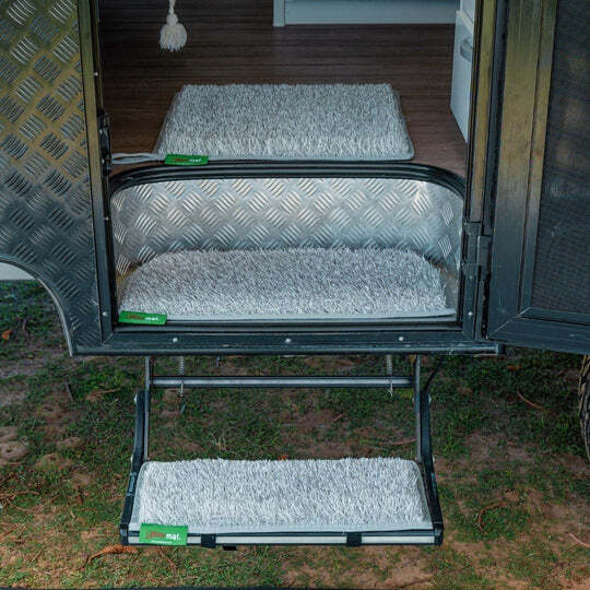 The Pull-Out Caravan Step is paired perfectly on the ground with a Large muk mat in Light Grey.