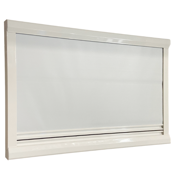 The interior roller blind and flyscreen unit feature a thin, non-intrusive frame design to complement any caravan or motor home design. Fitted with a pleated style blind and flyscreen, the aluminum powder-coated grab rails with magnetic strip hold allow 3 versatile window positions open, ventilation, and closed. The interior roller blind and flyscreen fit directly into the window frame providing easy and secure installation onto the caravan wall.