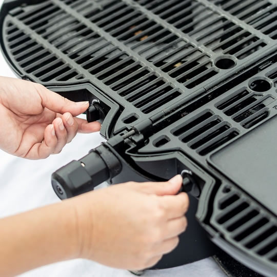 Fold out. To unlock the nomadiQ pull out and turn the knobs on both sides. Then you’re able to open the BBQ by its handle. If you want to lock the nomadiQ, turn the knobs back on both sides so it stands stable, firm and safe.