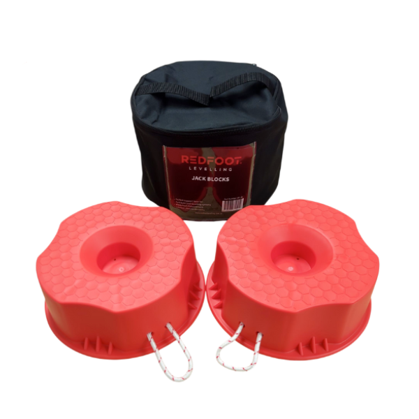 Get extra lift and support for your hydraulic levelling jacks and stabiliser legs with the Redfoot Jack Blocks. Comes in a pack of 2 blocks and handy storage bag. Handy rope points for easier placement and retrieval. Backed with a Limited Lifetime Warranty.