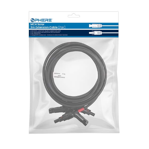 Extend your reach with the SPHERE 3.0m MC4 extension pair. Designed for flexible solar layouts, these cables maintain efficient current flow over distance thanks to their 4mm² heavy-duty construction. With factory-fitted MC4 connectors and IP67 waterproof protection, they offer secure performance in even the harshest environments.