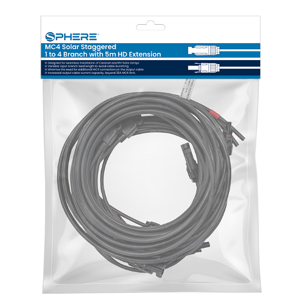 Engineered for high-output solar systems, the SPHERE 1-to-4 branch lead connects up to four panels to a single circuit with balanced, efficient power delivery. The staggered input lengths ensure clean routing and reduced bulk inside your array, while the 6mm² main line carries high current with minimal voltage drop.