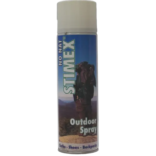 Stimex spray can pressure pack for use on outer surface of waterproof and windproof fabrics to maintain and preserve it.
