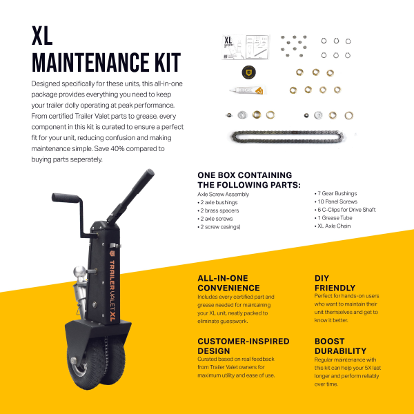The Trailer Valet XL Maintenance Kit is a complete package designed to help maintain and extend the life of your Trailer Valet XL. It includes all the necessary parts and grease to keep your trailer dolly performing at its best, making maintenance simple and cost-effective.